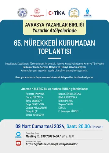 Özbekistan, Kazakistan, Türkmenistan, Arnavutluk, Kosova, K. Makedonya, Kırım ve Türkiye'den yazarların son eserlerini kendi seslerinden canlı okuyacakları Avrasya Yazarlar Birliği Yazarlık Atölyesi MÜREKEBİ KURUMADAN TOPLANTISI'na sizleri davet etmekten onur duyarız.