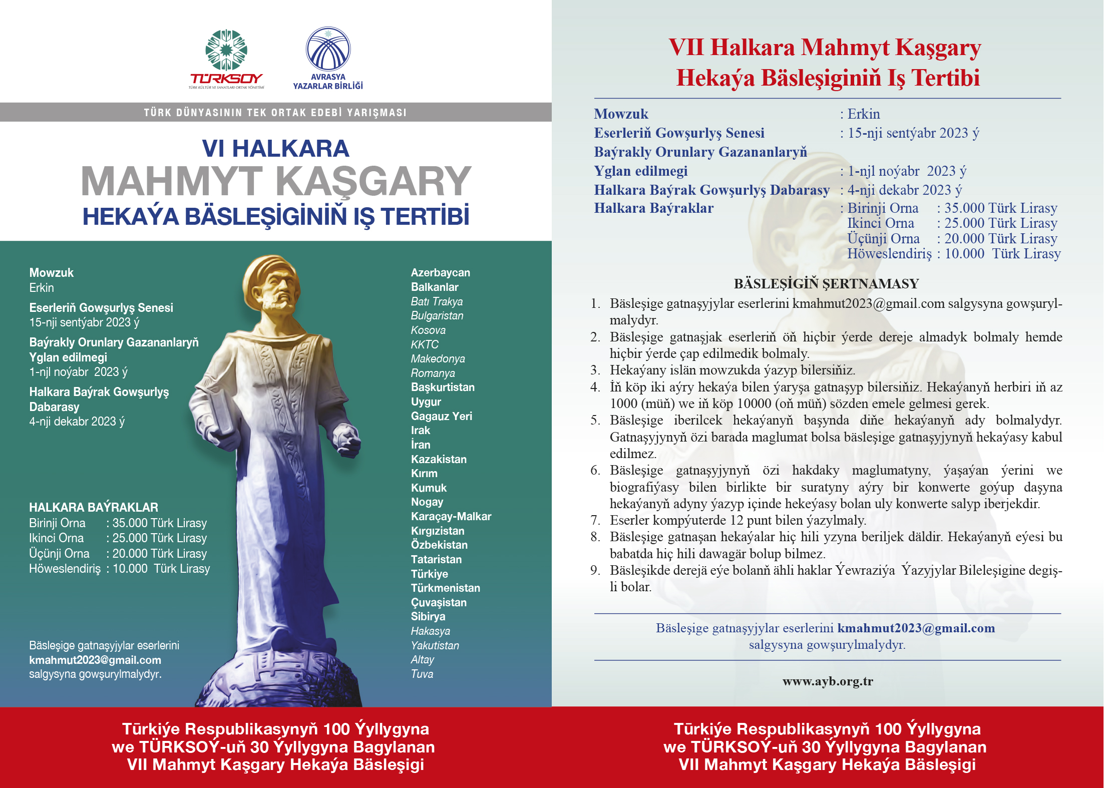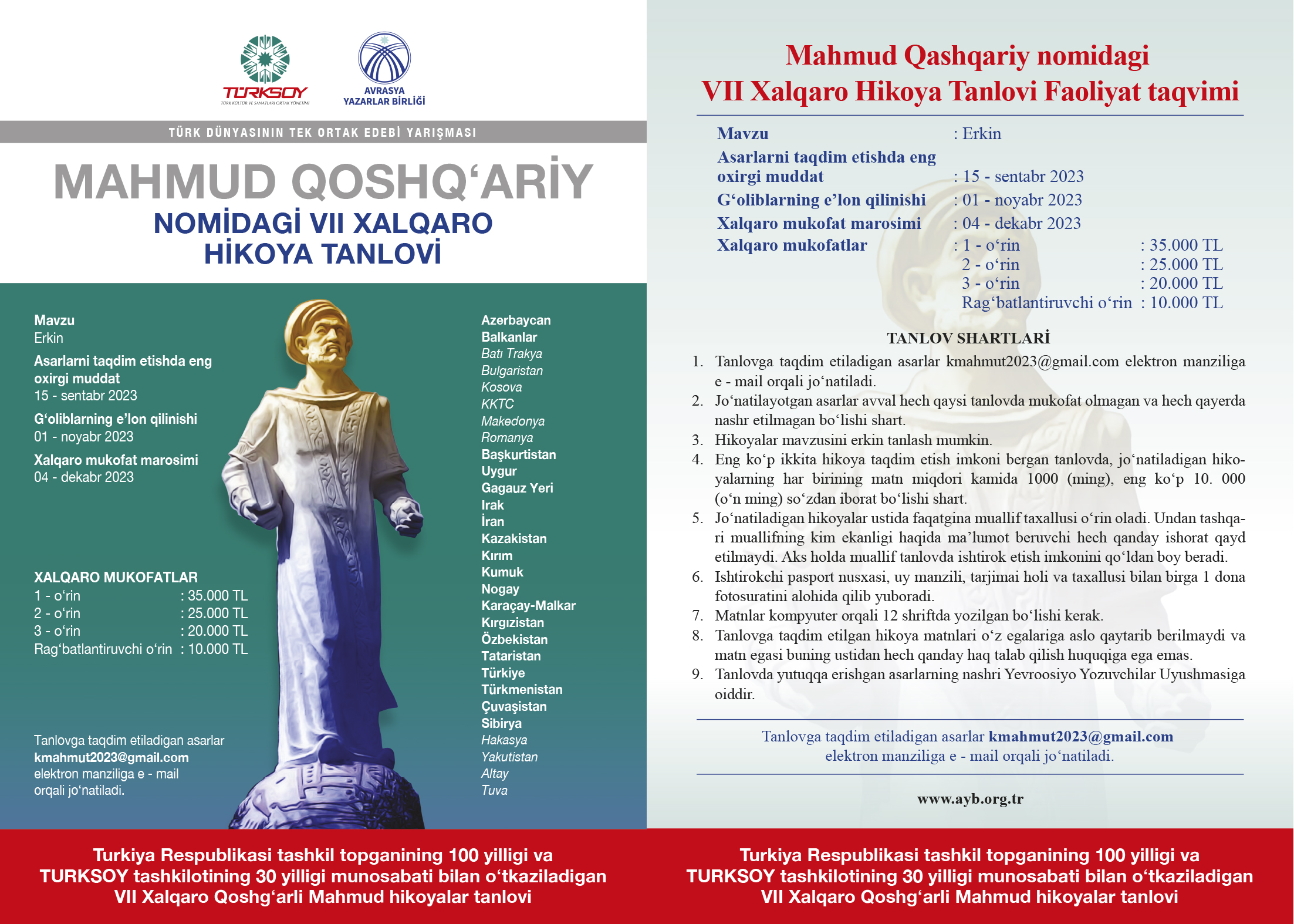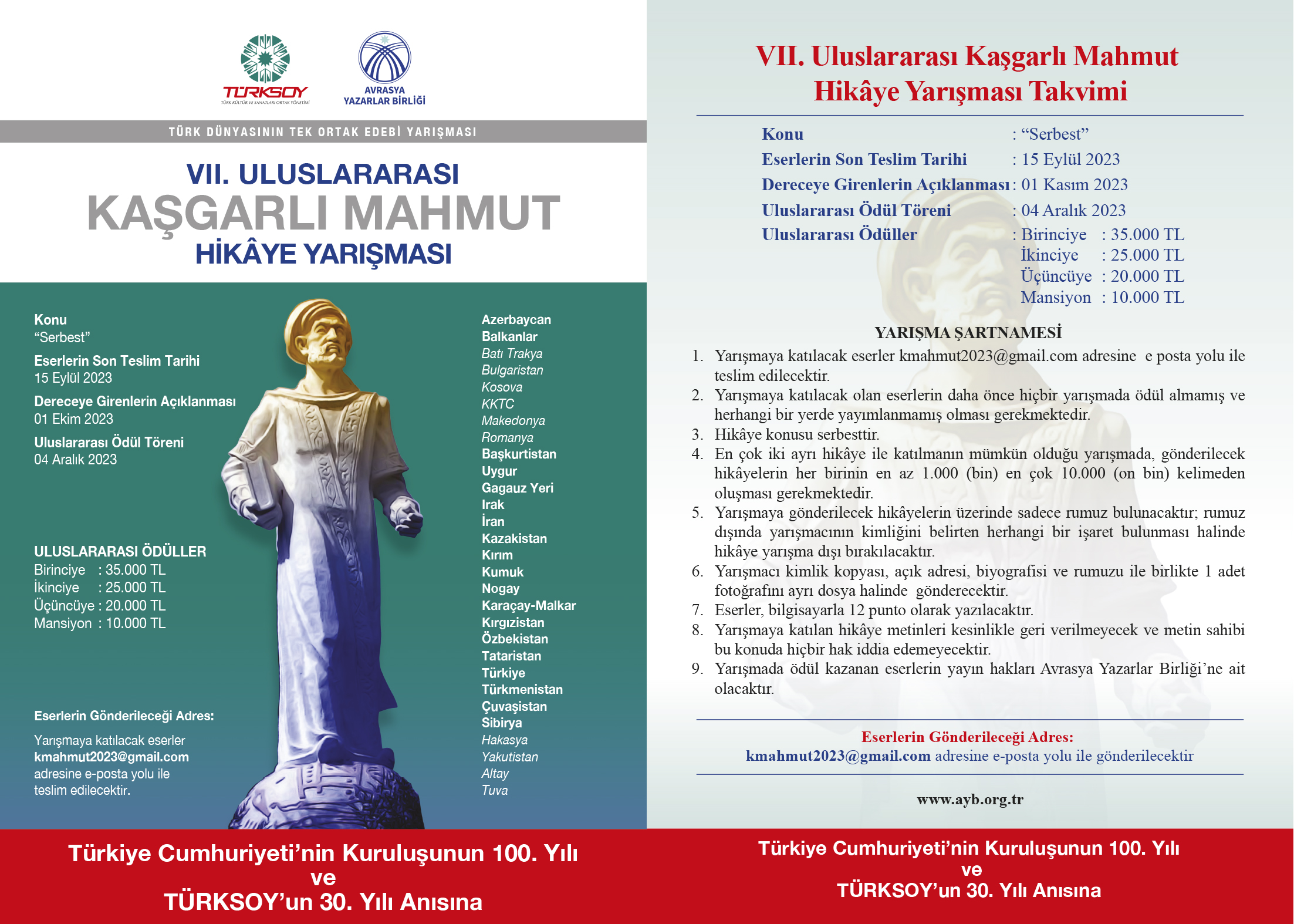 Türk Dünyasının Tek Ortak Edebî Yarışması niteliğindeki Uluslararası Kaşgarlı Mahmut Hikâye Yarışması bu yıl Türkiye Cumhuriyeti’nin Kuruluşunun 100. Yılı ve TÜRKSOY’un 30. Yılı Anısına düzenleniyor.