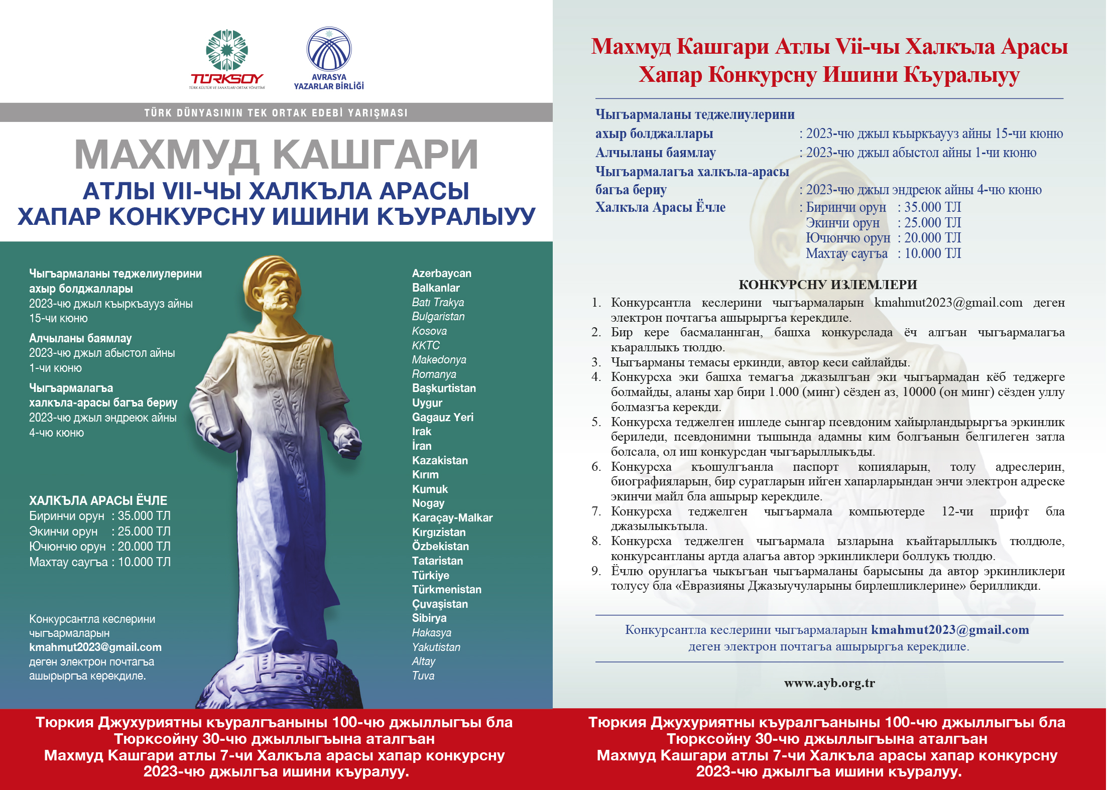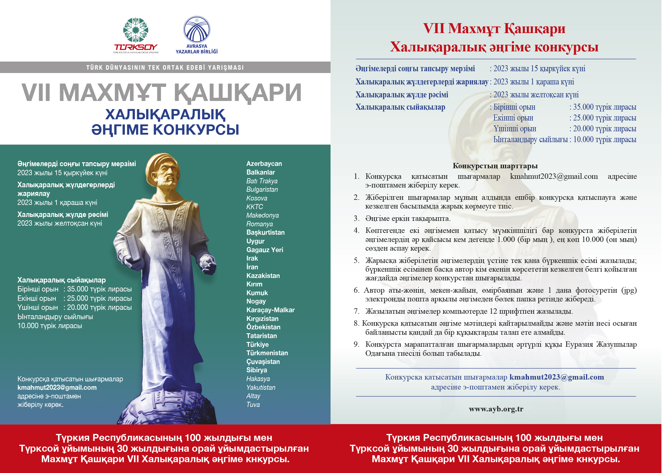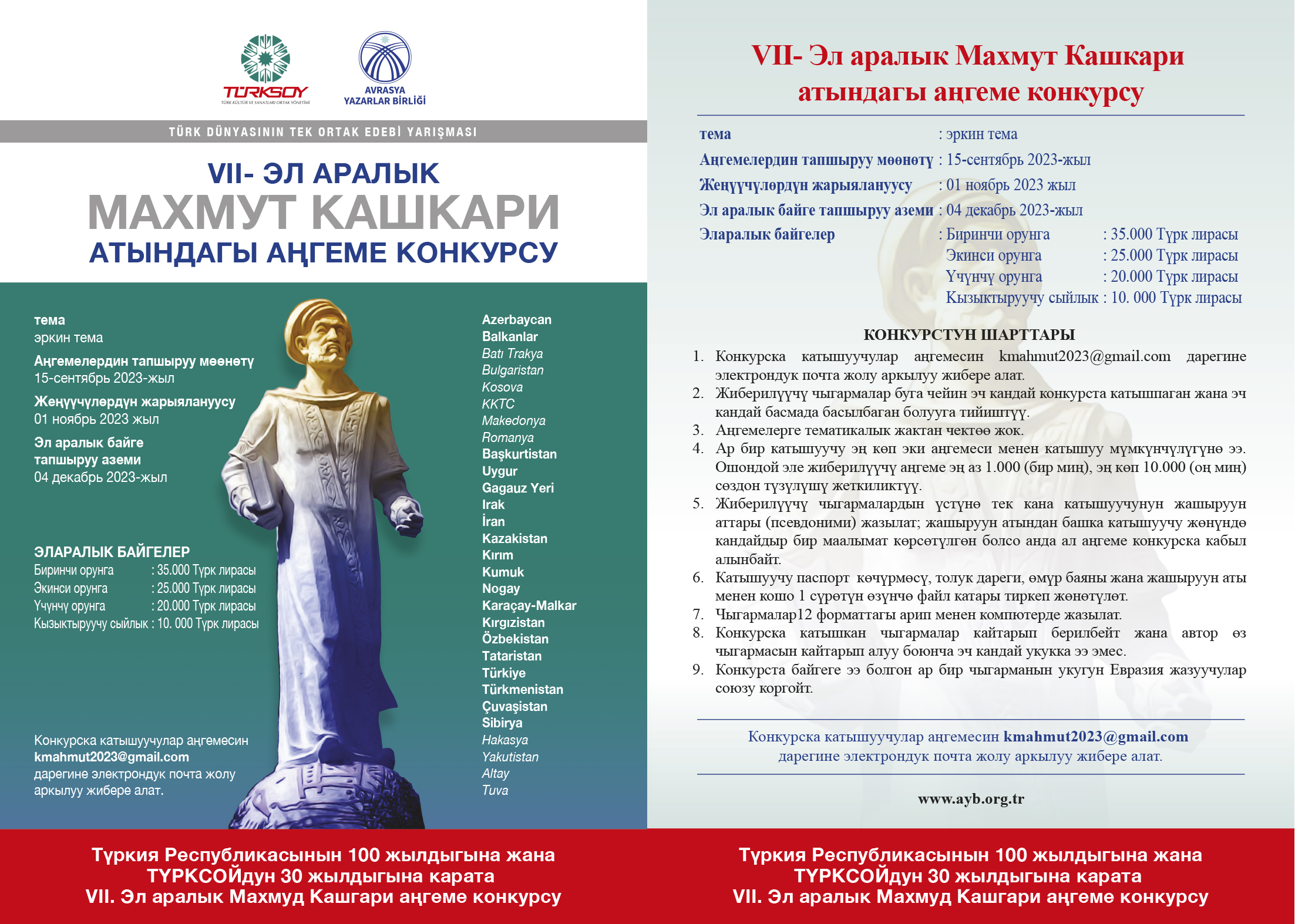 Türk Dünyasının Tek Ortak Edebî Yarışması niteliğindeki Uluslararası Kaşgarlı Mahmut Hikâye Yarışması bu yıl Türkiye Cumhuriyeti’nin Kuruluşunun 100. Yılı ve TÜRKSOY’un 30. Yılı Anısına düzenleniyor.